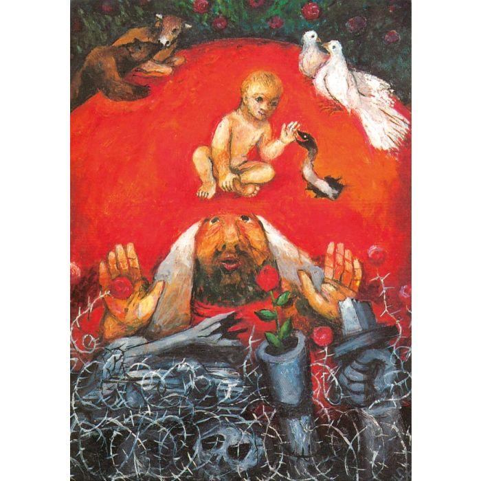 Sie halten das „Gesicht des Friedens“ in Ihren Händen. Der katholische Priester und Künstler Sieger Köder hat dieses Bild geschaffen. Er lebte von 1925 bis 2015 und wirkte im Raum Hohenlohe und Schwaben. Köder zählt zu den bekanntesten deutschen Malern christlicher Kunst, Bildhauern und Krippenbauern des 20. Jahrhunderts, er galt als ein kraftvoller und farbgewaltiger „Prediger mit Bildern“. Selbstlos stiftete er zahlreiche Werke seinen Gemeinden, so zum Beispiel Kirchenfenster in der Jakobuskirche auf dem Hohenberg im Ellwanger Land. Diese konnte ich kürzlich bewundern.